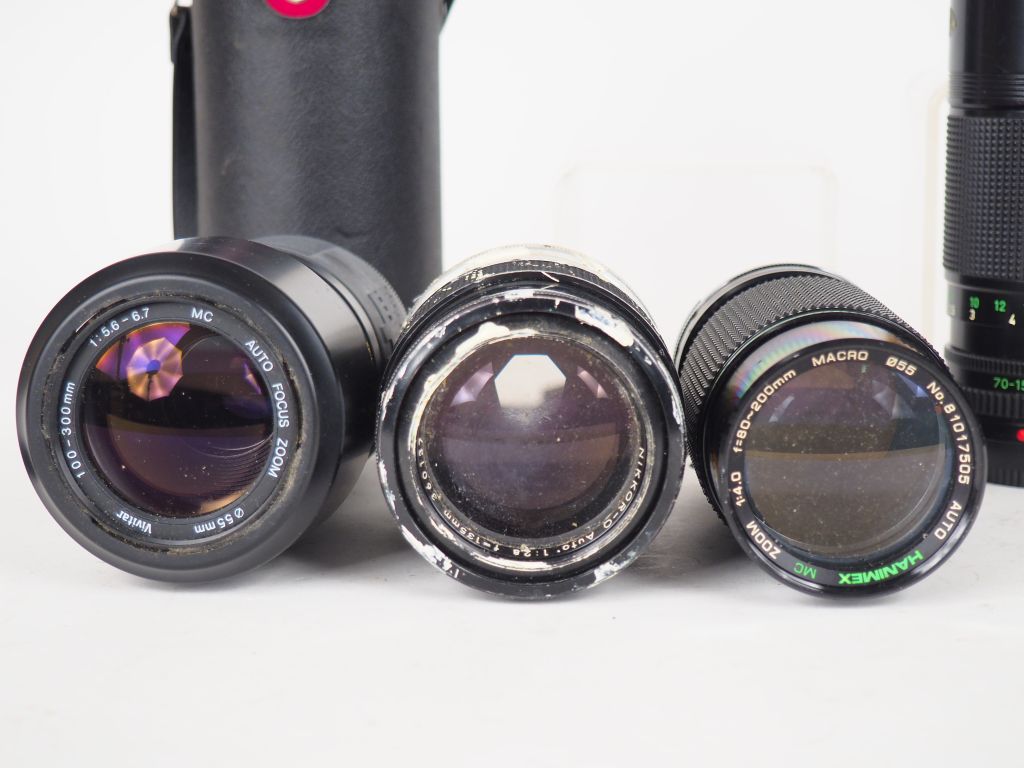 Lot de six objectifs différents (état d'usage) dont HANIMEX, VIVITAR, CANON, ISCO, NIKKOR
