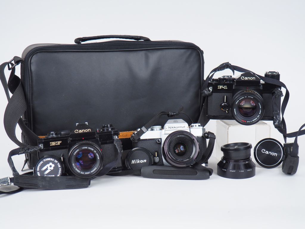 Lot de trois appareils photographiques dans une sacoche : - NIKKORMAT EL n°5165236 avec objectif NIKKOR F=50mm/1:2 n°3600997 - CANON EF n° 252678 avec objectif CANON FDF=50 mm/1:1.4 - CANON F-1 n°530267 avec objectif CANON FD F=50 mm/1:1.4 n°806298