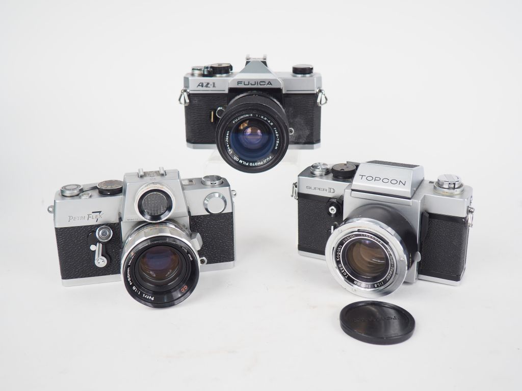 Lot de trois appareils photographiques : - FUJICA AZ-1 n°2126080 avec objectif FUJINON Z 1:3.5-4.5/43-75 - TOPCON SUPER D n°7106347 avec objectif TOPCOR 1:1,8/85 n°11666076 - PETRIFLEX 7 avec objectif PETRI 1:1.8/55 n°86766