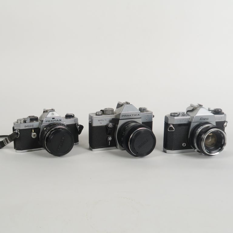 Lot de trois appareils photographiques : - KOWA SET R2 n°970955 1:1.9/f=50 mm n°637706 - PRAKTICA MTL3 avec objectif 1:4/f=24mm - PENTAX ASAHI MX n°9382396 avec objectif 1:4/f=50 mm