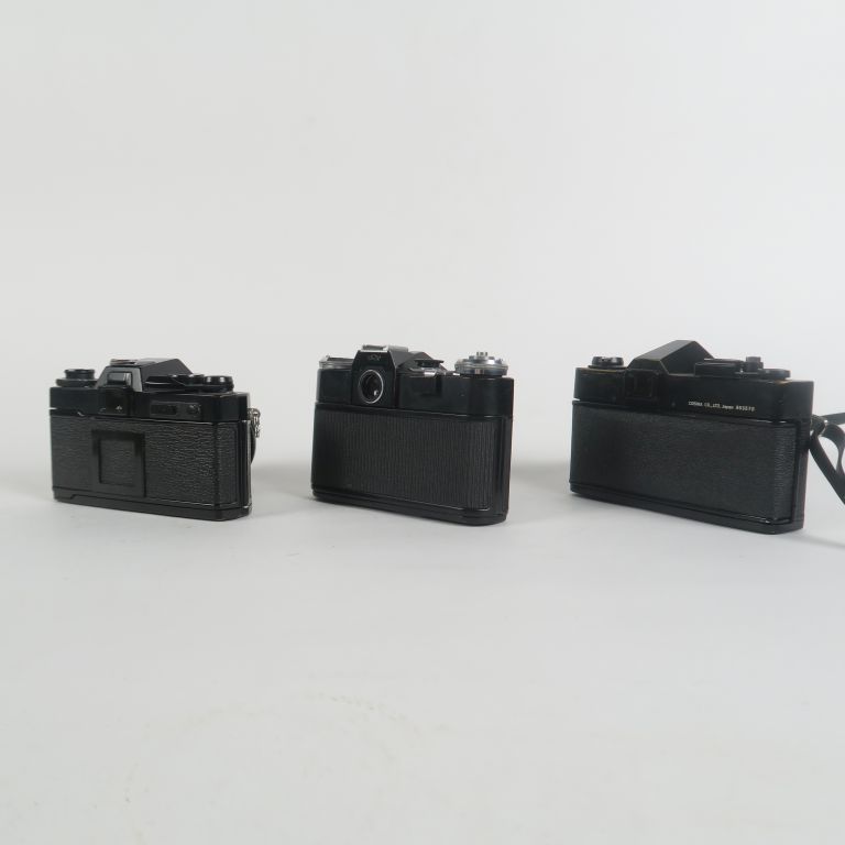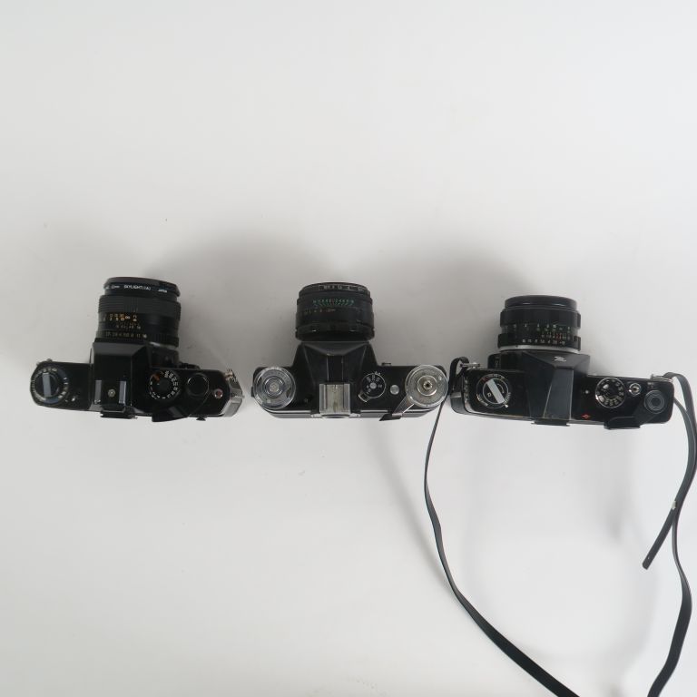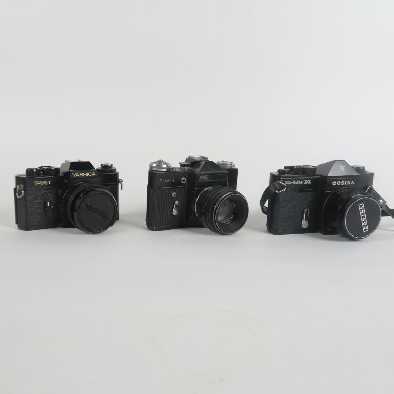 Lot de trois appareils photographiques : - YASHICA FR I n°171448 avec objectif 1:1.7/f=50 mm n°20155051 - COSINA DL n°963570 avec objectif COSINON 1:1.8/f=50 mm n°697089 - ZENIT E n°74403173 avec objectif 1:2/f=58 mm n°7457818