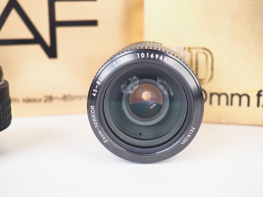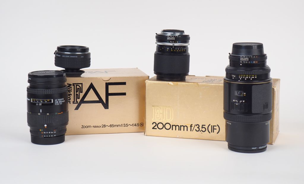 Lot de trois objectifs NIKON : - NIKKOR ED F=200 mm/1:3,5 n° 184578 dans sa boite - NIKKOR FAF F=28/85 mm /1:3,5/4,5 dans sa boite - NIKKOR ZOOM F=43/86 mm/1:3,5 1016948 On y joint LENS SCOPE CONVECTER