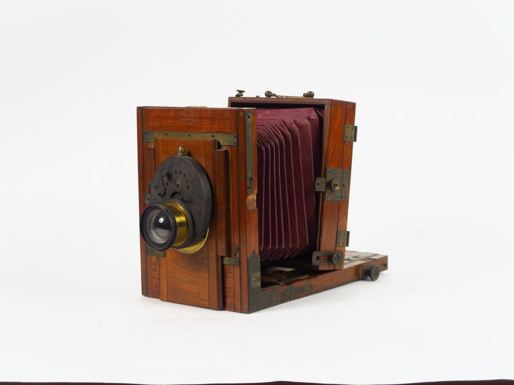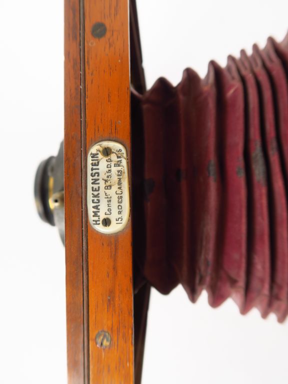 MACKENSTEIN. chambre touriste bois acajou 13x18 avec soufflet rouge. Objectif laiton sans marque sur obturateur Londe et Dessoudeix.