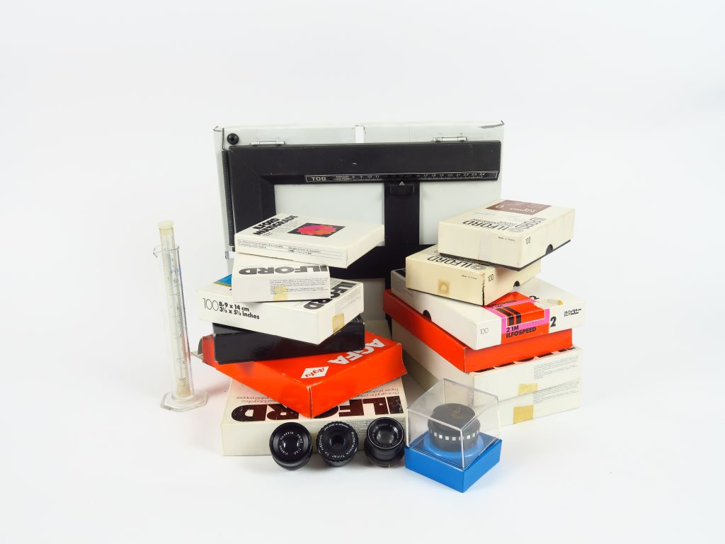 Margeur TOG 18x24. Huit boites papier Ilford entamées. Quatre boites papier Ilford non ouvertes. Un thermomètre et une éprouvette. On y joint quatre objectifs pour agrandisseurs : - Rodagon 5,6/80 - Angénieux 2,9/50 - Trinar 4/50 - Primz 3,5/50 - Deux Châssis presse en bois format 6x9 et 13x18