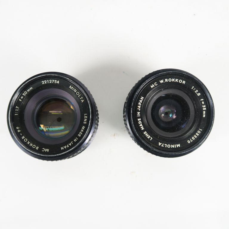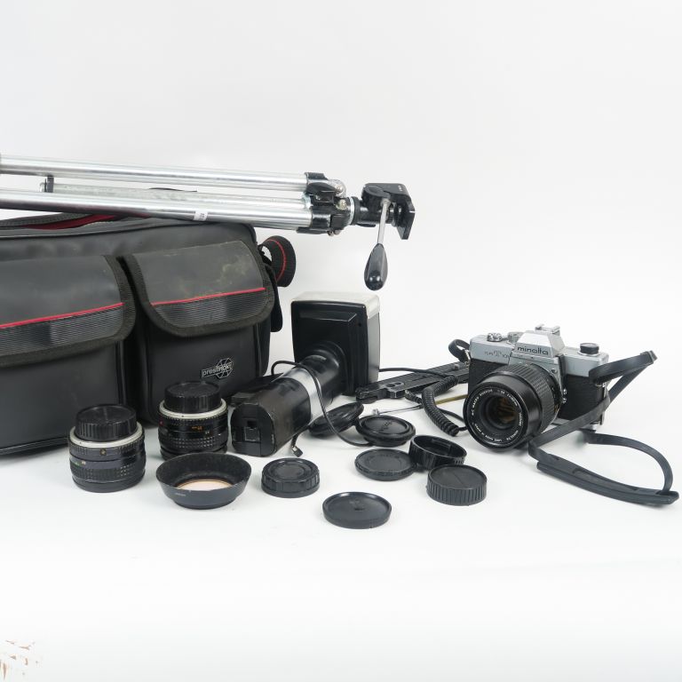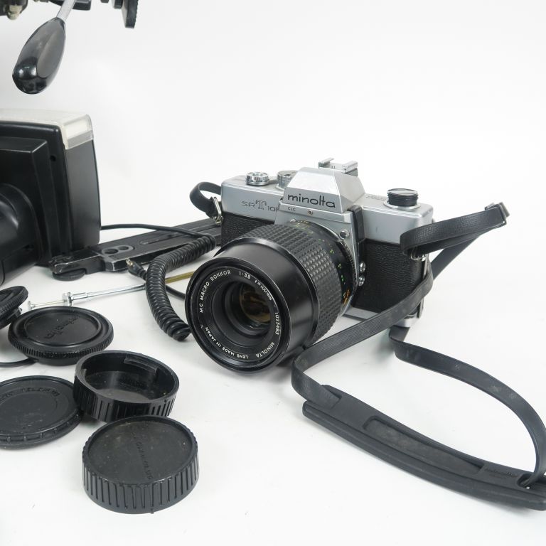 MINOLTA SRT101 n°3595973 avec trois objectifs : Objectif MINOLTA MC W. ROKKOR 1 : 2.8 f=35 mm n°1033976 Objectif MINOLTA MC ROKKOR PF 1 : 1.7 f=50 mm n°2212754 Objectif MINOLTA MC MACRO ROKKOR 1 : 3.5 f=100 mm n°1023483 On y joint une sacoche et des accessoires.