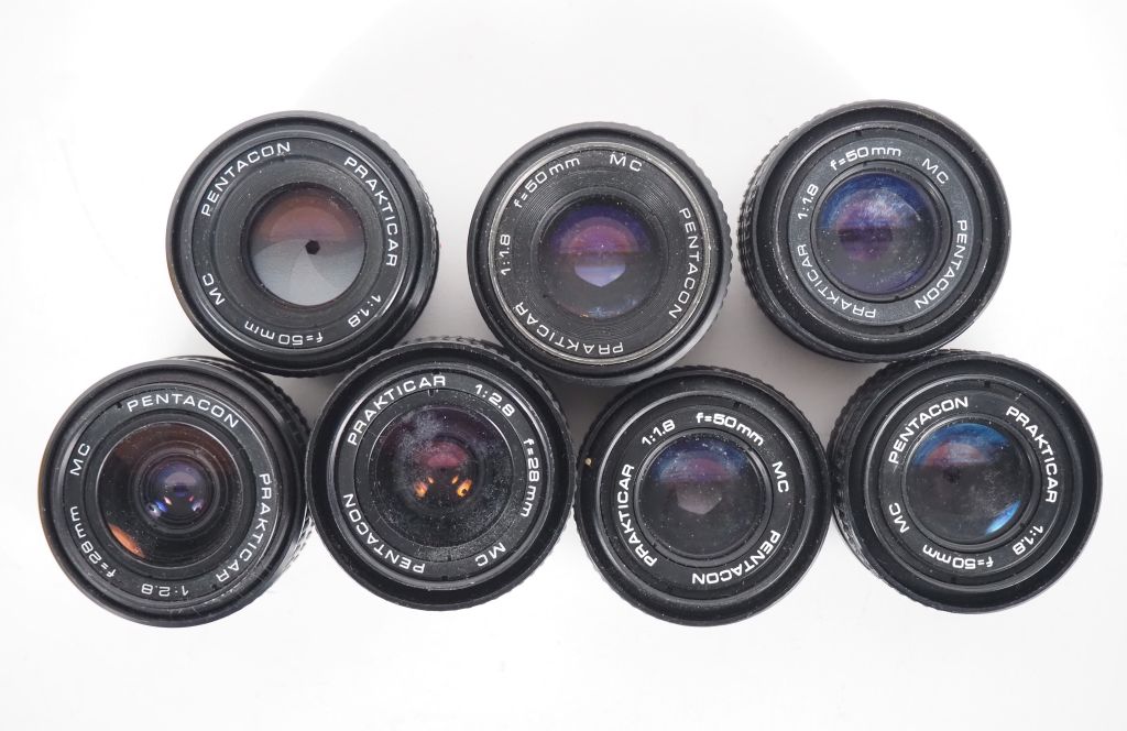 PENTACON. Lot de sept objectifs PRAKTICAR : - 5 x MC 1:2.8/50 - 2 x MC 1:2.8/28