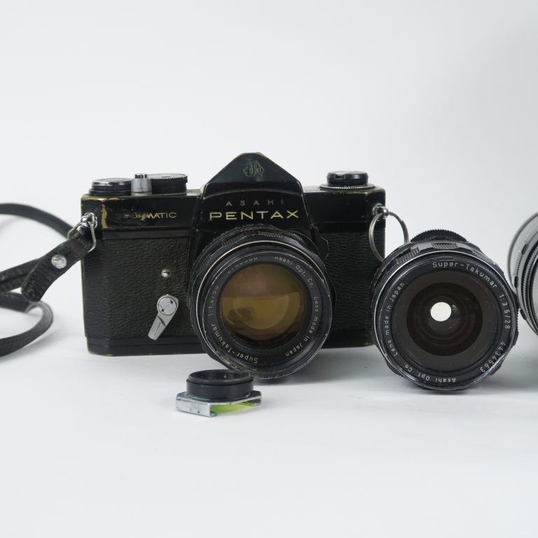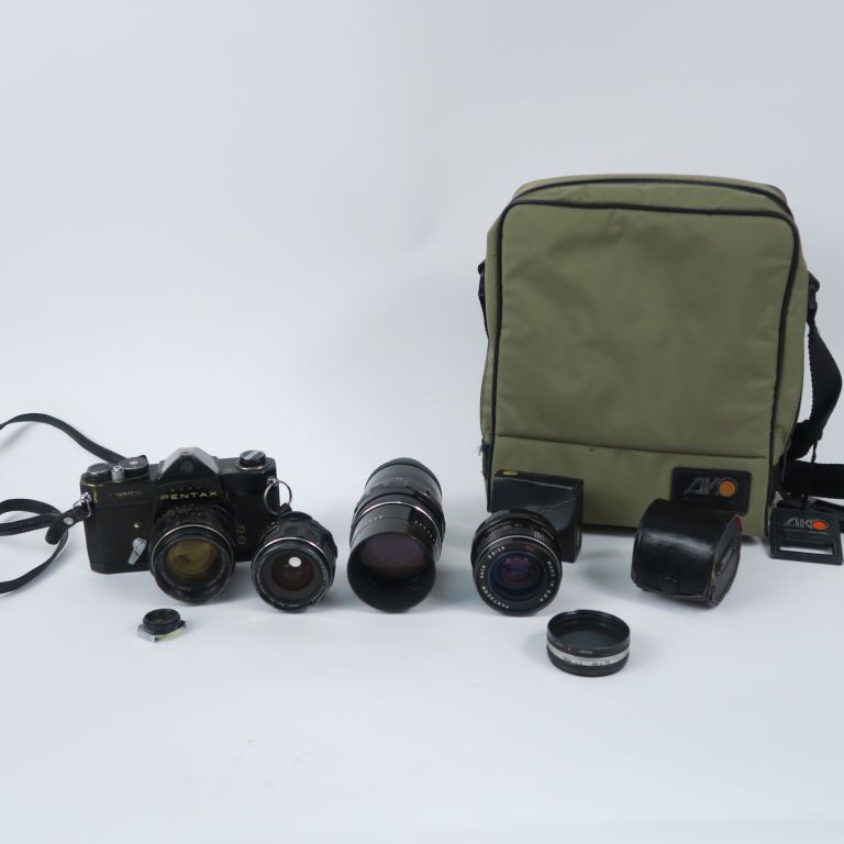 PENTAX SPOTMATIC n°2596208 avec objectif ASAHI Super Takumar 1 :1.4/50 n°2746580. On y joint un objectif PENTACON Auto 2.8/29 + objectif ASAHI Super Takumar 1 :3.5/28 n°4424563 + objectif PENTACON 4/200 n°7055424 + filtres. L’ensemble dans une sacoche de marque AKO.