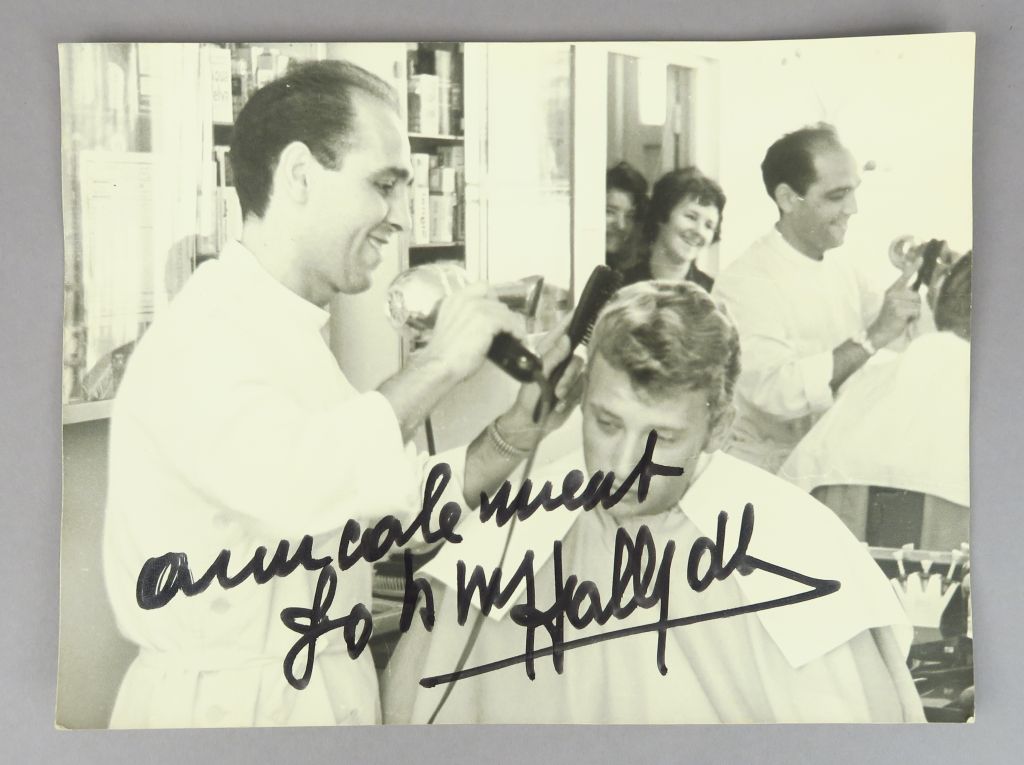 Photo en noir et blanc figurant Johnny Hallyday chez le coiffeur. Dédicacée par le chanteur "Amicalement Johnny Hallyday". 18 x 24 cm