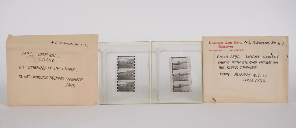 PHOTOGRAPHIE. Lot de six négatifs XIXème sur l'Angleterre, l'Ecosse ou Toulon : - London Lumière : 'Paddle steamer and barge on the river Thames'. Circa 1896. Print : Probably Warwick trading company, circa 1898. - Balmoral Scotland : 'The gatering of the clans'. 1898. Print : Warwick trading company, 1898. - Liverpool Lumière : 'Taken by the operator who made the first films to be shot in Ireland, probably during the course of his return'. 1896. Print : Warwick trading company, circa 1898. - London Lumière : 'Queen's Victoria's diamond jubille procession'. 1897. Film specimen and emulsion preparation. Edison type perforations on print. Probably Warwick trading company, circa 1898. - Toulon Lumière : 'Battleship in the outer harbour'. 1896. Print : Probably Warwick trading company, circa 1898. - Deux négatifs non titrés et non situés