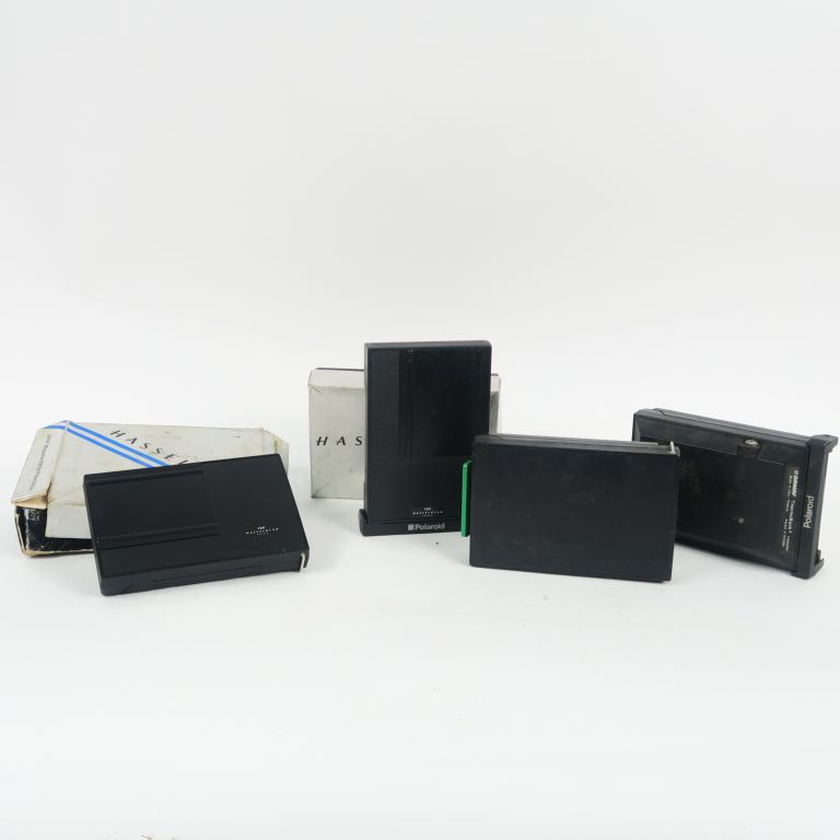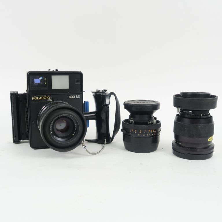 POLAROÏD 600 SE n°MAL80033B avec trois objectifs : Objectif MAMIYA 1 : 4.7 f : 127 mm n°11875 Objectif MAMIYA 1 : 5.6 f : 75 mm n°10958 Objectif MAMIYA 1 : 5.6 f : 150 mm n°10235 On y joint lot de quatres dos POLAROÏD dont deux HASSELBLAD