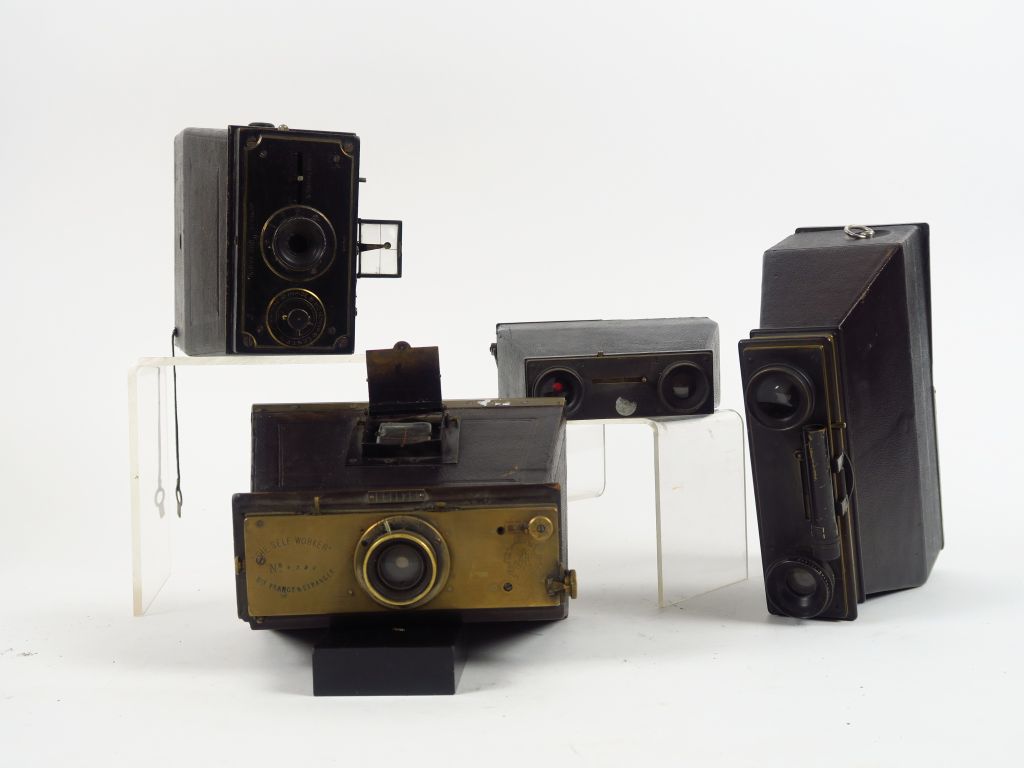 Quatre appareils photo jumelle : - Quo Vadis format 9x12 - The Self Worker format 9x12. Objectif Pipon. - Photo jumelle JC format 6x9 - Photo jumelle JC petit modèle