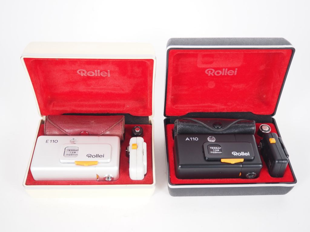 ROLLEI. Lot de deux appareils photographiques miniatures dans leur coffret : - A110 n°3024273 - E110 n°3166586