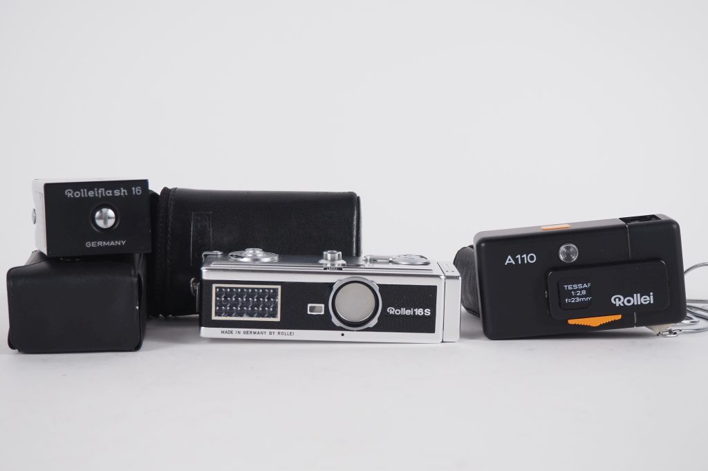 ROLLEI. Lot des deux appareils photographiques miniatures : - 16 S n°2744831 avec étui et flash - A110 avec étui (manque)