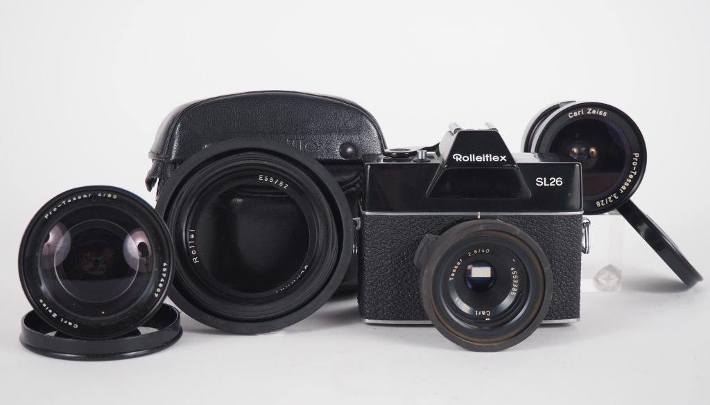 ROLLEIFLEX SL 26. Appareil photographique n°3504035 avec trois objectifs : - TESSAR 1:2.8/40 n°4553385 avec pare soleil - PRO-TESSAR 1:4/80 n°457807 et pare soleil E55/62 - PRO-TESSAR 1:3.2/28 n°4916991