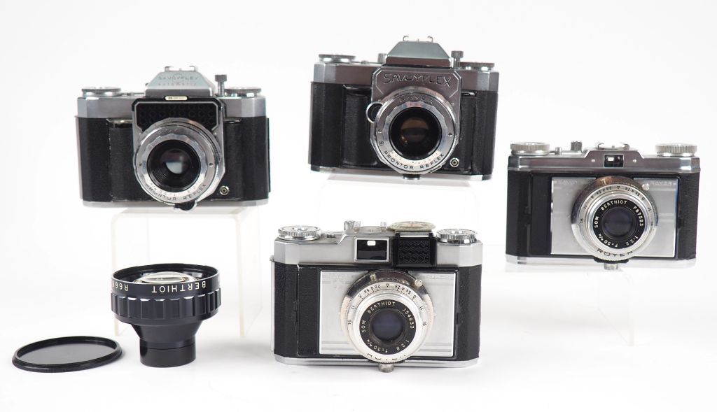 ROYER. Lot de quatre appareils photographiques et un objectif : - SAVOYFLEX avec objectif SOM BERTHIOT 1:2.8/50 n°R64777 - SAVOYFLEX AUTOMATIC avec objectif SOM BERTHIOT 1:2.8/50 n°Q23250 - SAVOY avec objectif SOM BERTHIOT 1:2.8/50 n°F87523 - SAVOY avec objectif SOM BERTHIOT 1:2.8/50 n°J54833 On y joint un objectif SOM BERTHIOT HYPER-FLOR 35 n°R66821