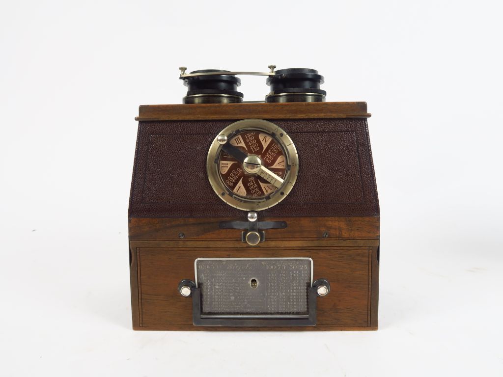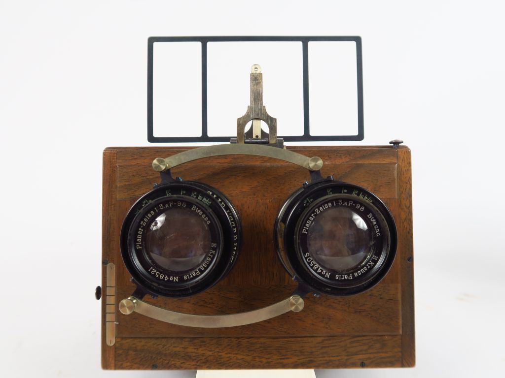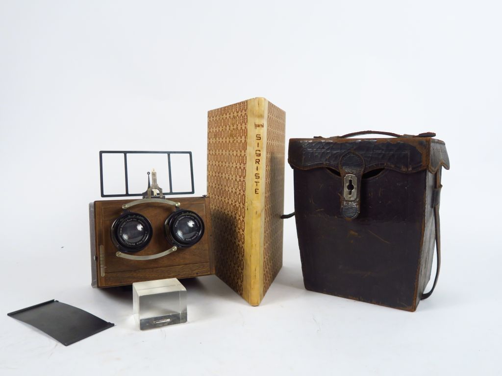 S.O.L. SIGRISTE. Stéréo 6x13, inventé par Jean Guido en 1898. Appareil pour 12 vues de 6x13 cm. Avec dos à plaques 6x13, complet avec ses porte plaques et plaques. Soufflet intérieur en bel état. Objectifs Krauss Planar - Zeiss 3,6/98. Sac d'origine. Bel état.