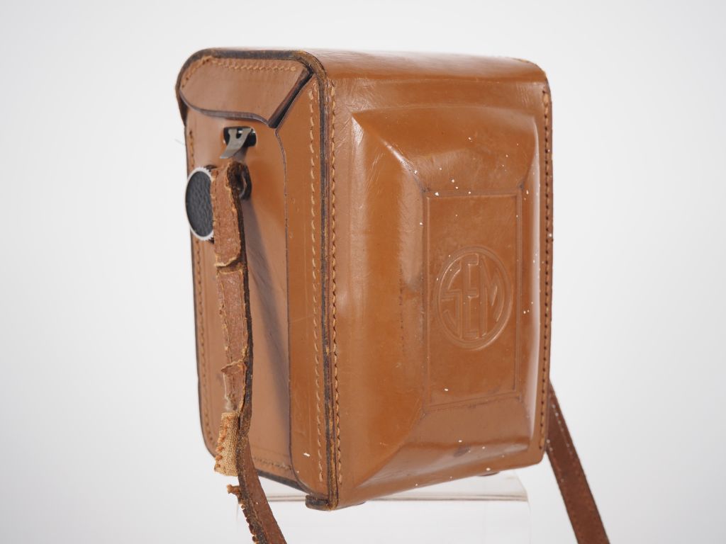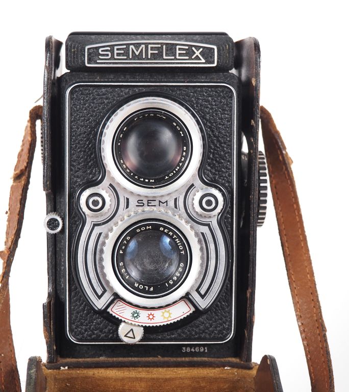 SEMFLEX. Appareil photographique 6 x 6 n°384691 avec objectifs SOM BERTHIOT 1:2.8/75 n°F71295 et 1:3.5/75 n°G25651 et étui.