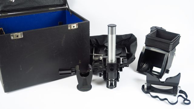 Sinar : Chambre 4x5 inch banc optique Norma, objectif Sironar 5,6/135 sur obturateur, compendium, miroir, 6 chassis doubles, mallette Cond : bel état