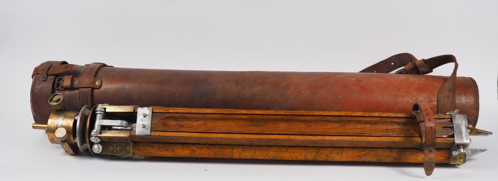 SRPI Puteaux, grand trépied en bronze et bois n°51/4 'M.C' MLE 1939 non magnétique dans une housse en cuir