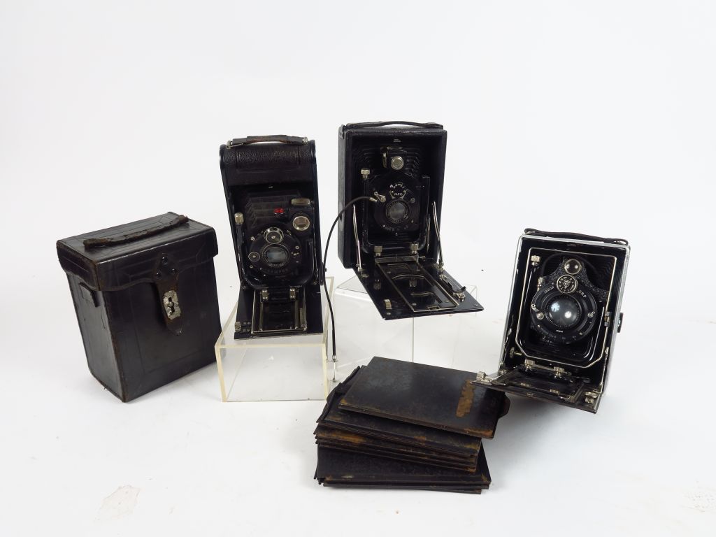 Trois appareils folding : - Deux Folding format 9x12. Neuf châssis.Objectif Supra 6,8/135. Objectif Primula 4,5/13,5 cm, en l'état. Etui. - Contessa Nettel. Folding 6x9. Objectif Tessar 6,3/13,5 cm.