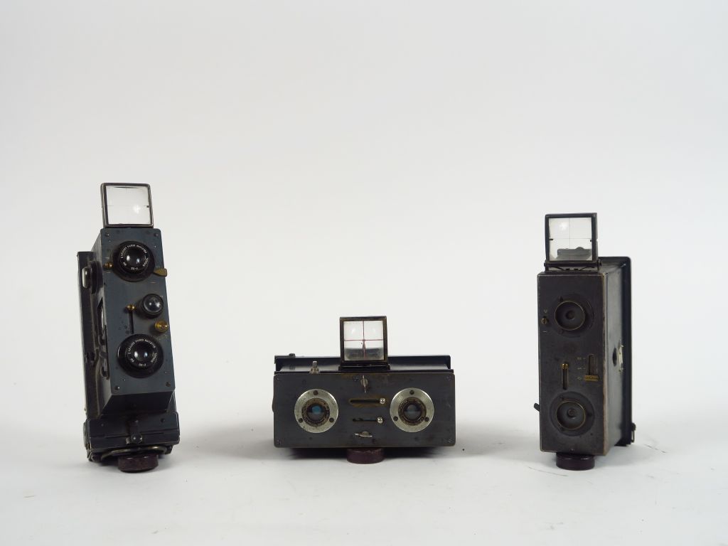 Trois appareils Stéréo 45x107 : - Jules Richard. Le Glyphoscope - Demaria-lapierre - Jules Richard. Objectifs Tessar 55 mm. Dos plaques