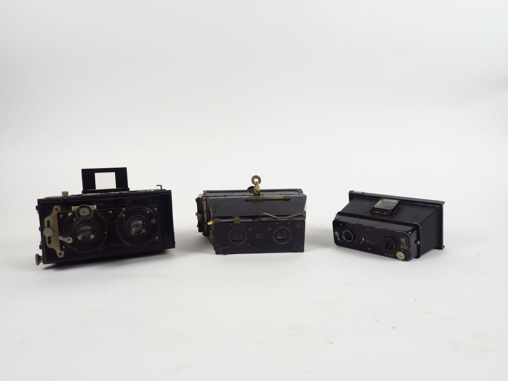 Trois appareils Stéréo : - Gallus format 6x13. Peut servir de prise de vue et visionneuse - Oto. Stéréo format 6x13. Objectif Minor. Dos plaques - Stéréo format 6x13. Appareil avec objectif Roussel Stylor 4,5/75 avec dos plaques.