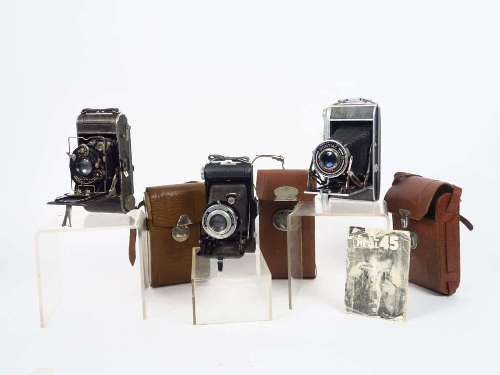Trois folding, différents modèles et marques : - Pontiac métal 45. Objectif Berthiot Spécial 4,5/105.Notice et étui - Lumiere, Folding 6x9. Objectif Spector 4,5/105. Etui - Phot, Folding 6x9 pour film et plaque. Objectif Doppel 4,5/105. Etui