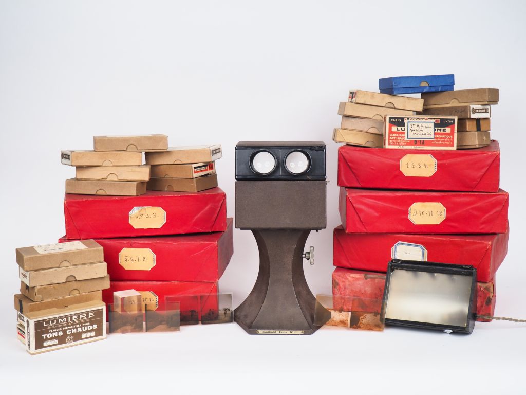 Visonneuse moderne avec lot important de plaques photographiques. (Suisse, Chamonix, Marseille, Royan, Ariège, Bandol, Collioure, Tarn, Mont St Michel, Aix, Paris, Le Cap/Palavas, Ventoux, Neiges, Montpellier, Guerre 14/18, Avignon, Tarascon, Arles, Le Puy, Lyon, Clermont, St Flour, Savoie, Bruxelles, Orange,