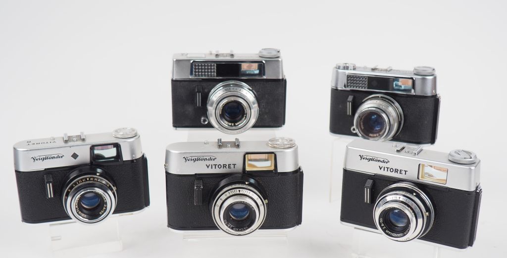 VOIGTLANDER VITORET. Lot de cinq appareils photographiques : - LR n°794817 avec objectif LANTHAR 1:2.8/50 - VITORET n°1106068 avec objectif LANTHAR 1:2.8/50 - R n°186899 avec objectif LANTHAR 1:2.8/50 - VITORET n°174429 avec objectif VASKAR 1:2.8/50 - DR n°568365 avec objectif LANTHAR 1:2.8/50