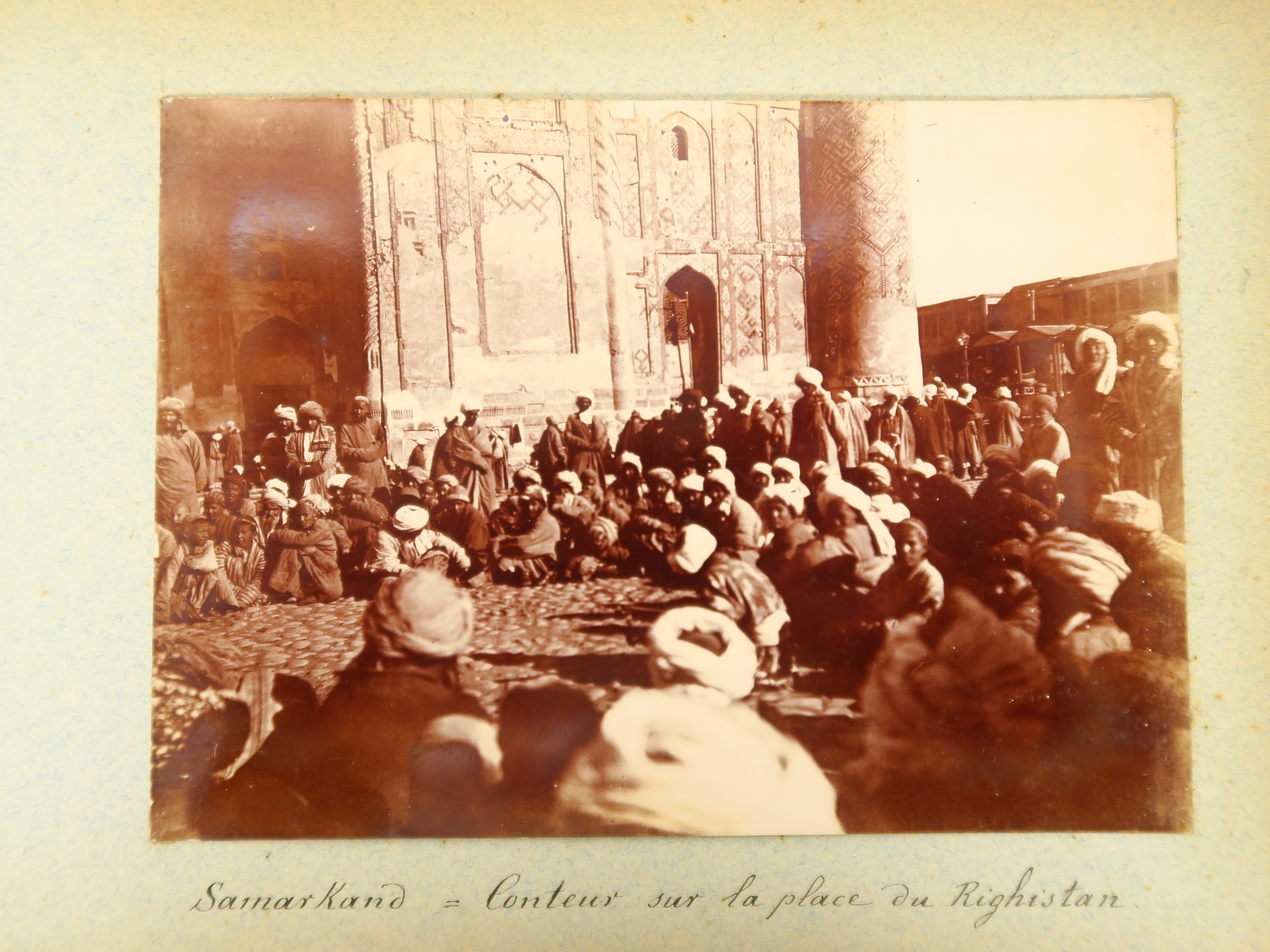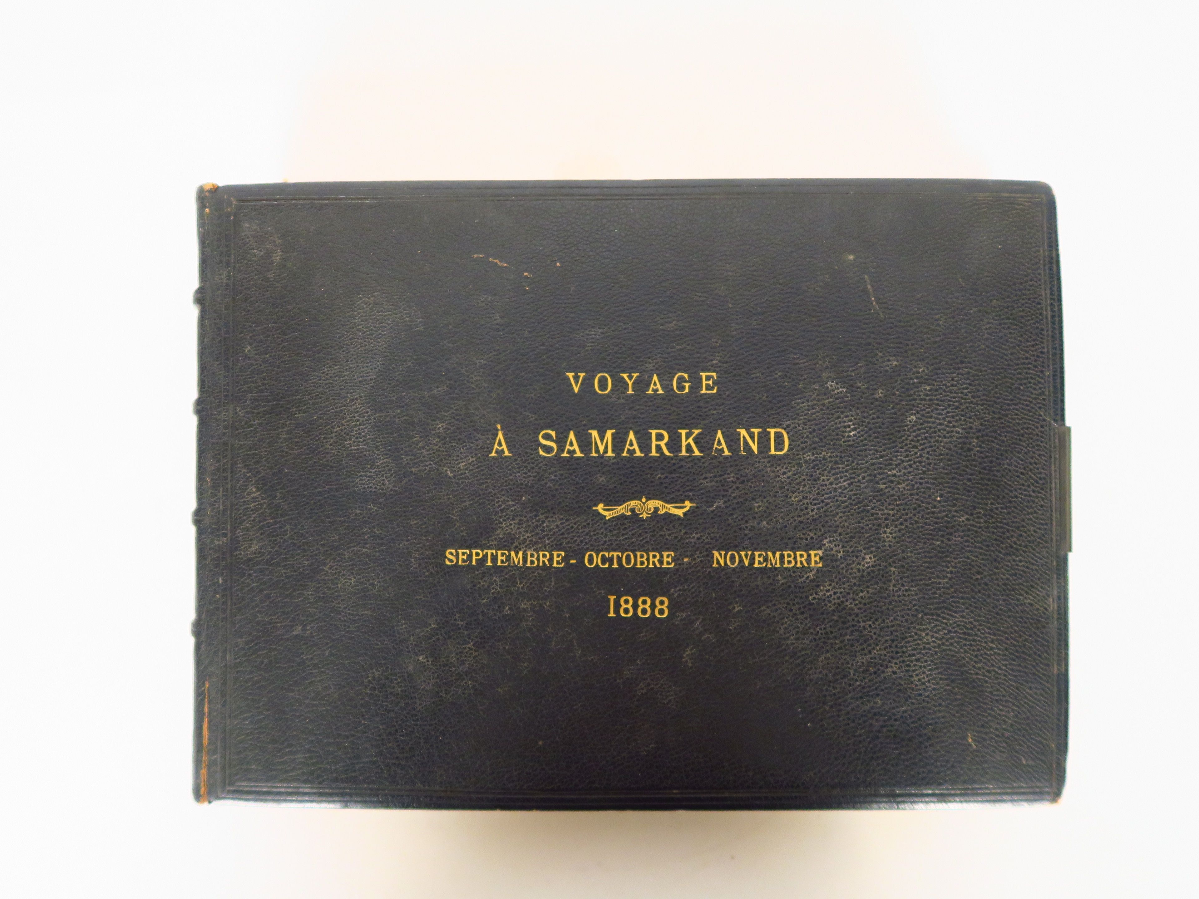 "Voyage à Samarkand" Album de 43 photographies de voyage comprenant des vues de Samarkand et Boukhara en Ouzbékistan. Première de couverture en cuir, titrée "septembre-octobre-novembre, 1888". (dimensions des photographies variables)
