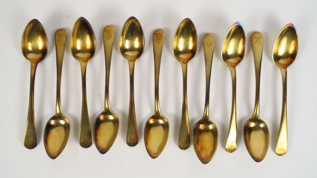 11 cuillères à café en vermeil monogrammées, poinçon au coq. 234 g