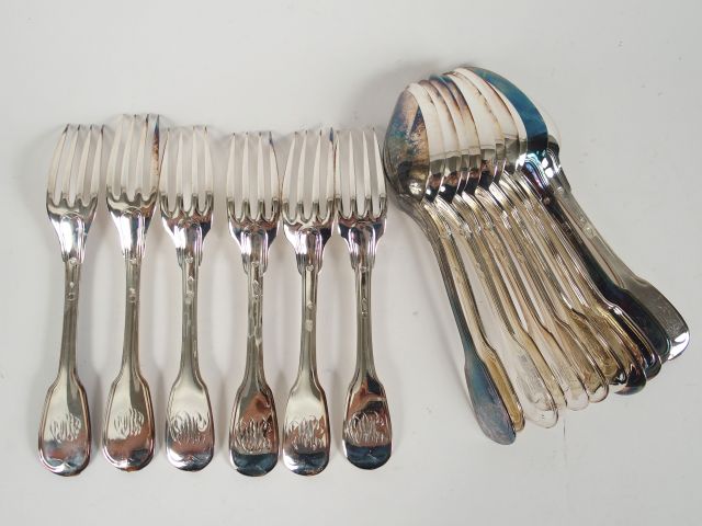 11 cuillères et 6 fourchettes en argent, poinçons dépareillés. Poids: 1440gr