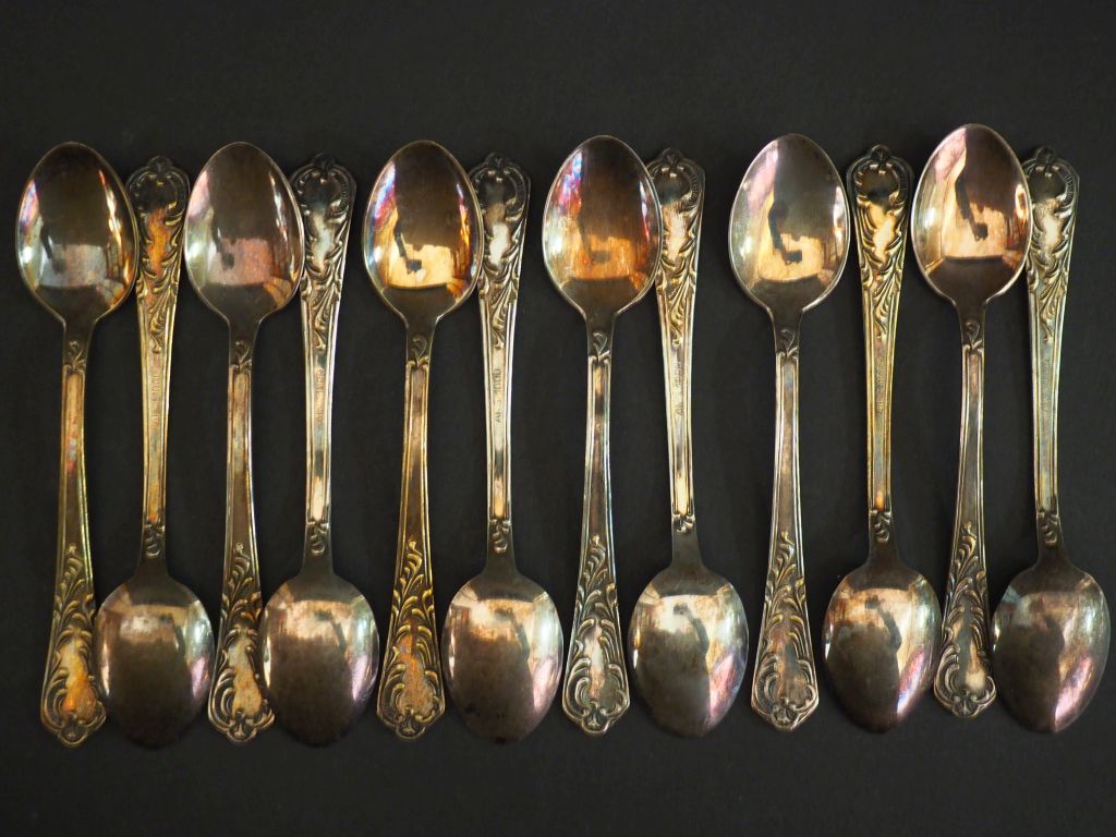 Lot de 12 cuillères à café en argent, modèle feuillagé. Poids : 139 g au prix de 30 à 40 € en vente aux enchères par l'hôtel des ventes Primardeco