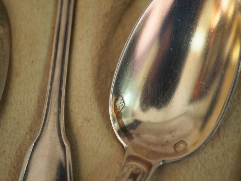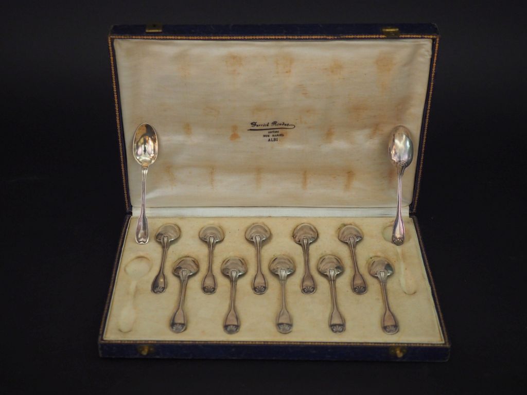12 cuillères à café en argent, poinçon Minerve, modèle à coquille. Poids : 190 g