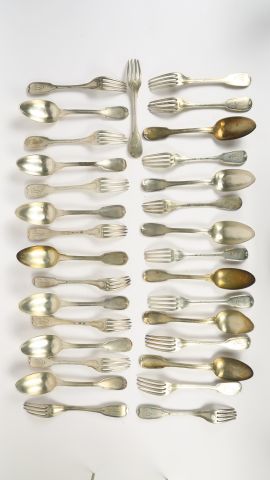 18 fourchettes et 13 cuillères en argent XVIIIe ou début XIXème, modèle au filet monogrammés. 2683 g , 12 grandes cuillères en argent modèle au filet 859 g Poids total : 3542g