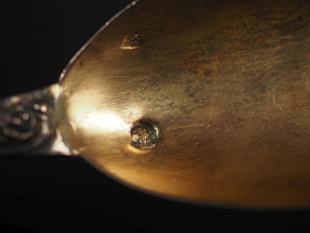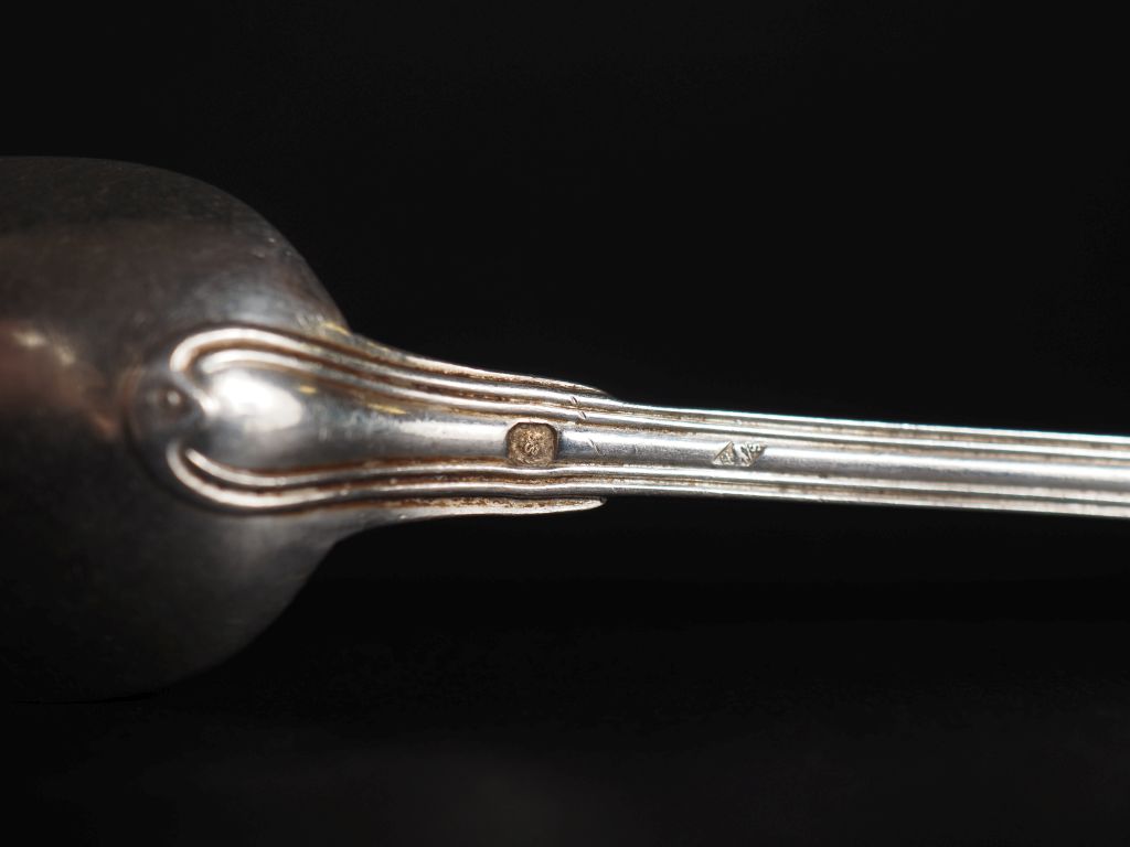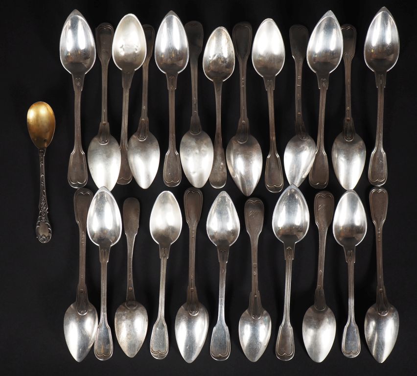 24 petites cuillères en argent, poinçon Minerve, modèles dépareillés On y joint une cuillère à œuf en argent et vermeil, poinçon Minerve Poids total : 570 g