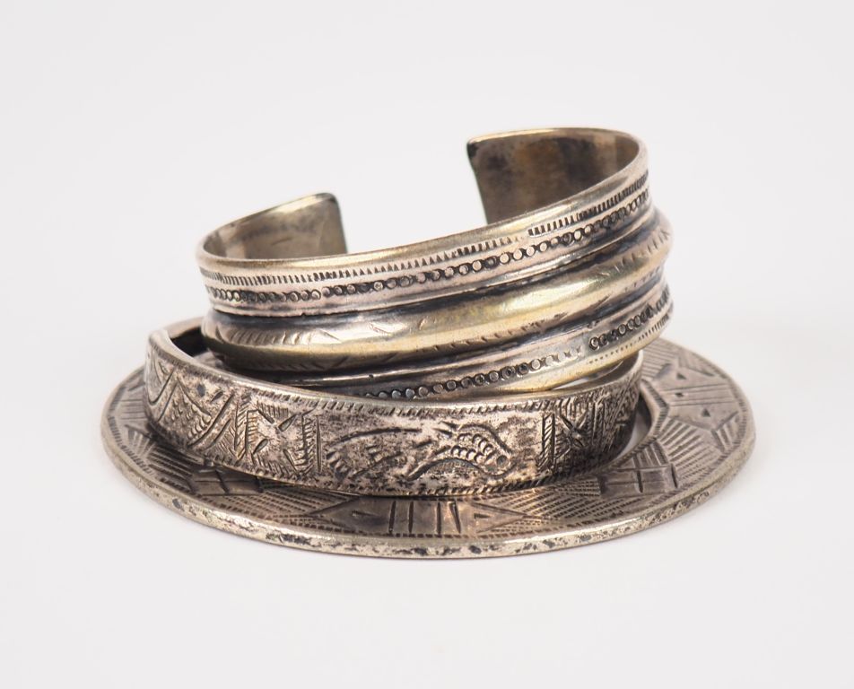 3 bracelets Afrique du nord en métal argenté ou argent bas titre à décor de motifs géométriques. Poids. 269 g.