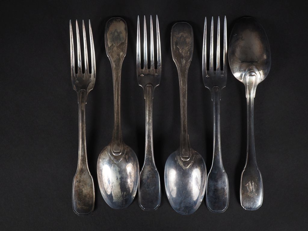 3 couverts en argent, poinçon Minerve, modèle à filet, monogrammé Poids : 502 g