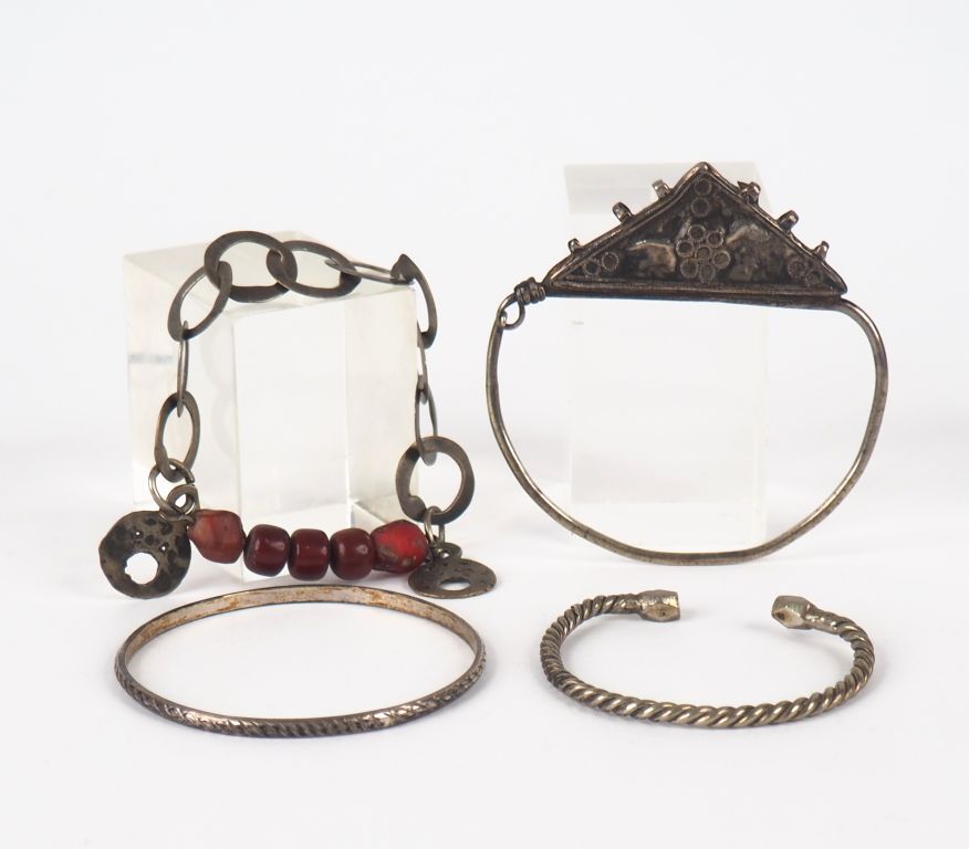 4 bracelets Afrique du nord en métal argenté ou argent bas-titre et pierres dures. Poids tel. 70 g.