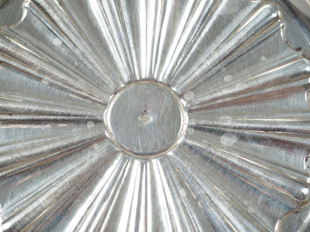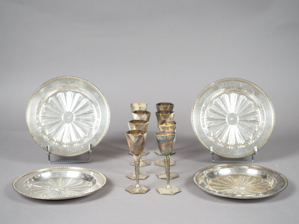 4 dessous de bouteilles et 8 verres à liqueur en métal argenté.
