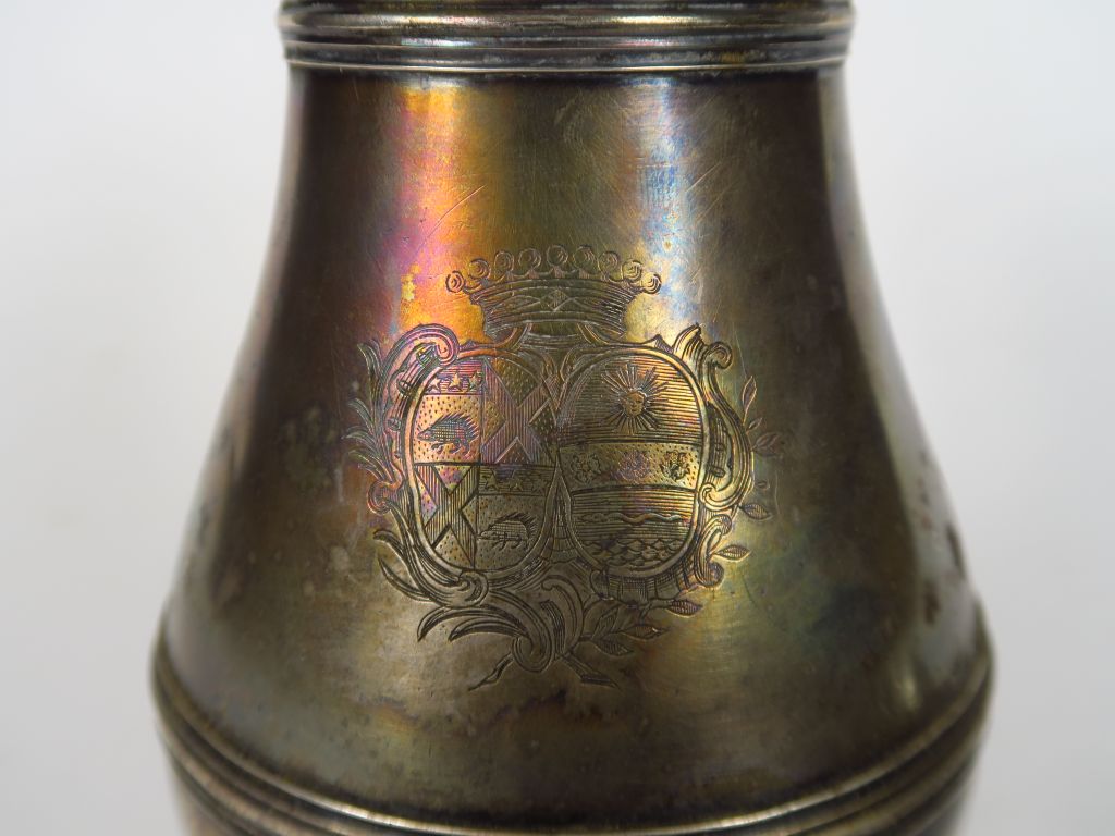 Aiguière et son bassin en argent uni. L’aiguière, de forme balustre, pose sur un piédouche bordé d’un jonc. Le corps est ceinturé de deux bandeaux décorés de filets. Le couvercle à charnière se termine par un dôme surmonté d’un fruit et son feuillage. L’anse à enroulements accompagnés de filets est surmontée d’un escargot d’eau douce. La panse et le fond du bassin sont gravés d’armoiries d’alliance surmontées d’une couronne comtale dans un encadrement de rocailles et de feuilles. Le bassin est de forme ovale à contours bordés de filets. Maître orfèvre Jean Bellon reçu en 1759 Montpellier 1764 Poids de l’ensemble 1753 g Hauteur de l’aiguière 29cm Jean Bellon fit son apprentissage durant environ sept ans chez François Thomas Germain . Il obtenu un document royal le dispensant de chef d’oeuvre et déposa son poinçon à Montpellier en Janvier 1759. Expert : Edouard de Sevin