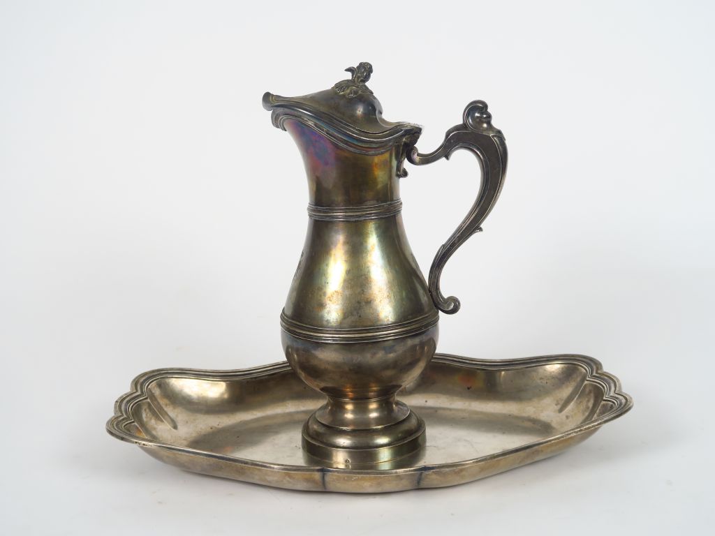 Aiguière et son bassin en argent uni. L’aiguière, de forme balustre, p...