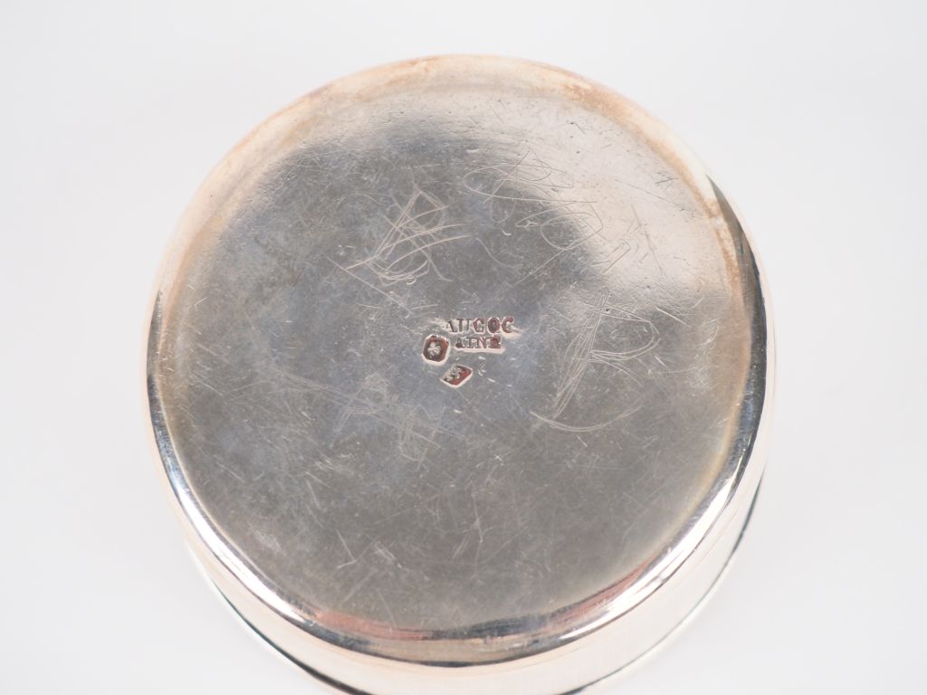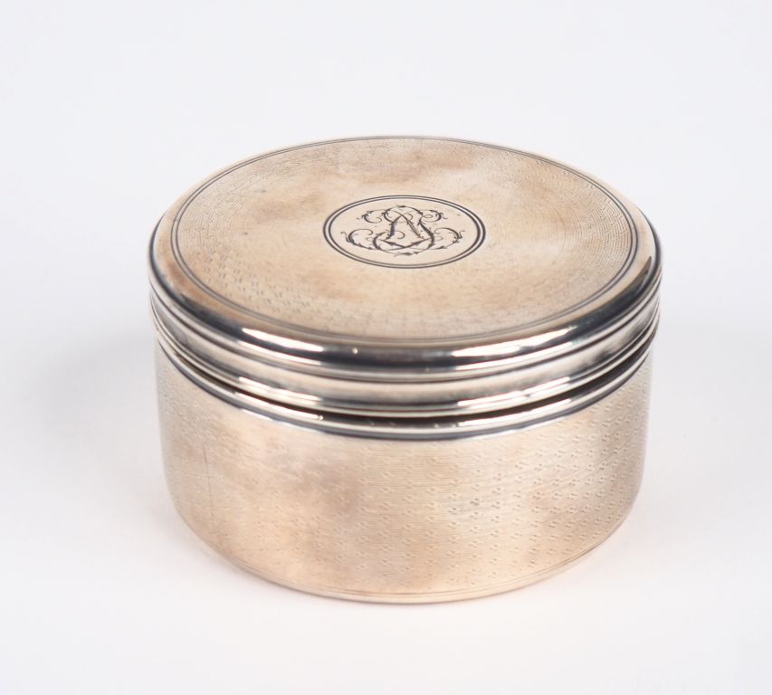 AUCOC Ainé Boite ronde en argent et vermeil, poinçon Minerve, à décor guilloché. Le couvercle orné d'un monogramme en médaillon. H. 3,7 cm Diam. 6,8 cm Poids. 115 g