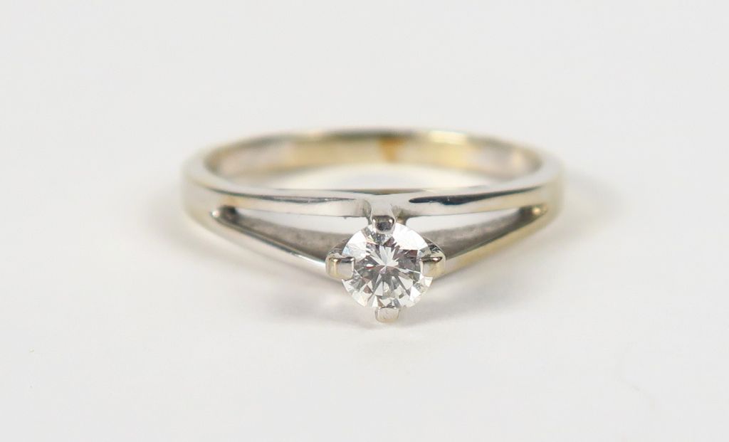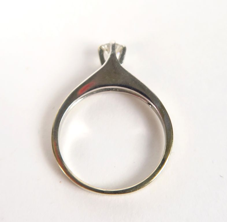 Bague solitaire en or blanc ornée d'un brilalant de 0,15 carats environ. Poids tel : 2,5 g. TDD : 49