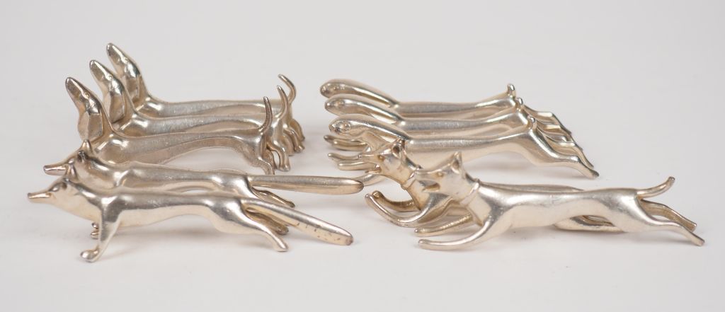 Benjamin Rabier (d'après) Suite de dix porte-couteaux en forme d'animaux en métal argenté.