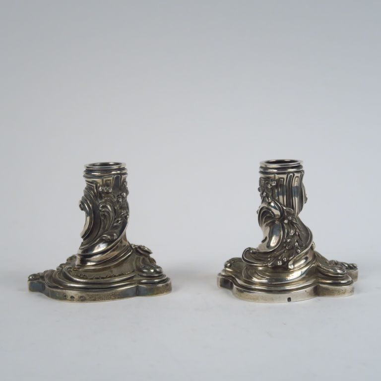 BOINTABURET à Paris. Paire de bougeoirs de toilette de style rocaille en argent, poinçon Minerve. H. 8,5 cm Poids. 630 g