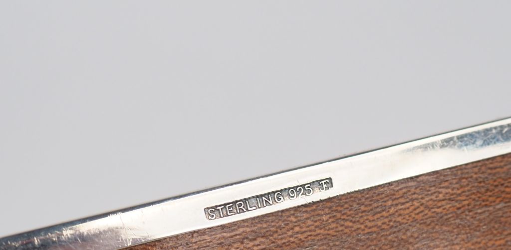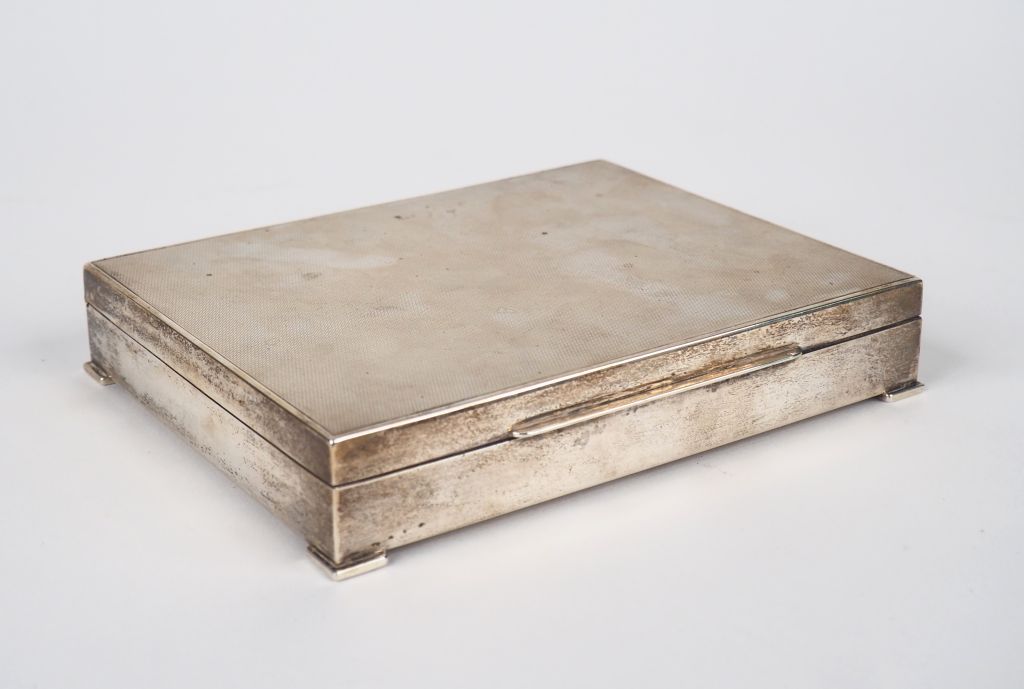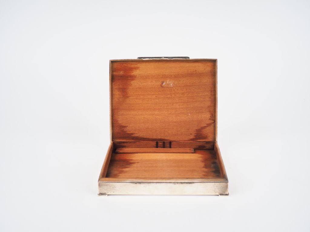 Boite à cigarettes en argent anglais 925, le couvercle à décor guilloché. Intérieur bois à deux compartiments. 2,7 x 16,2 x 12,8 cm Poids tel. 523 g