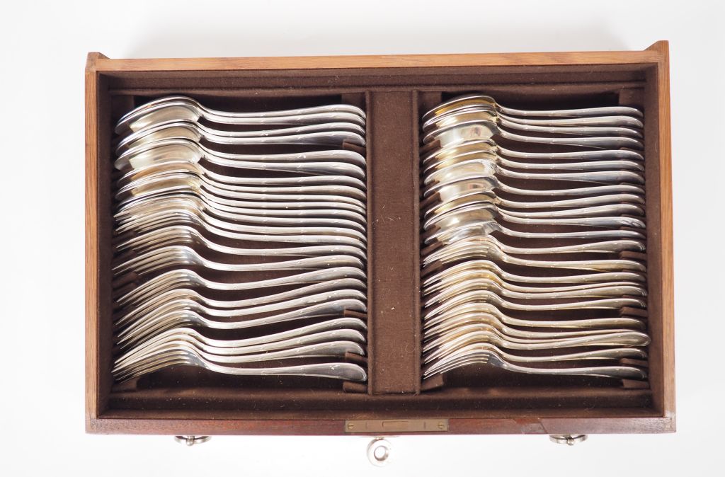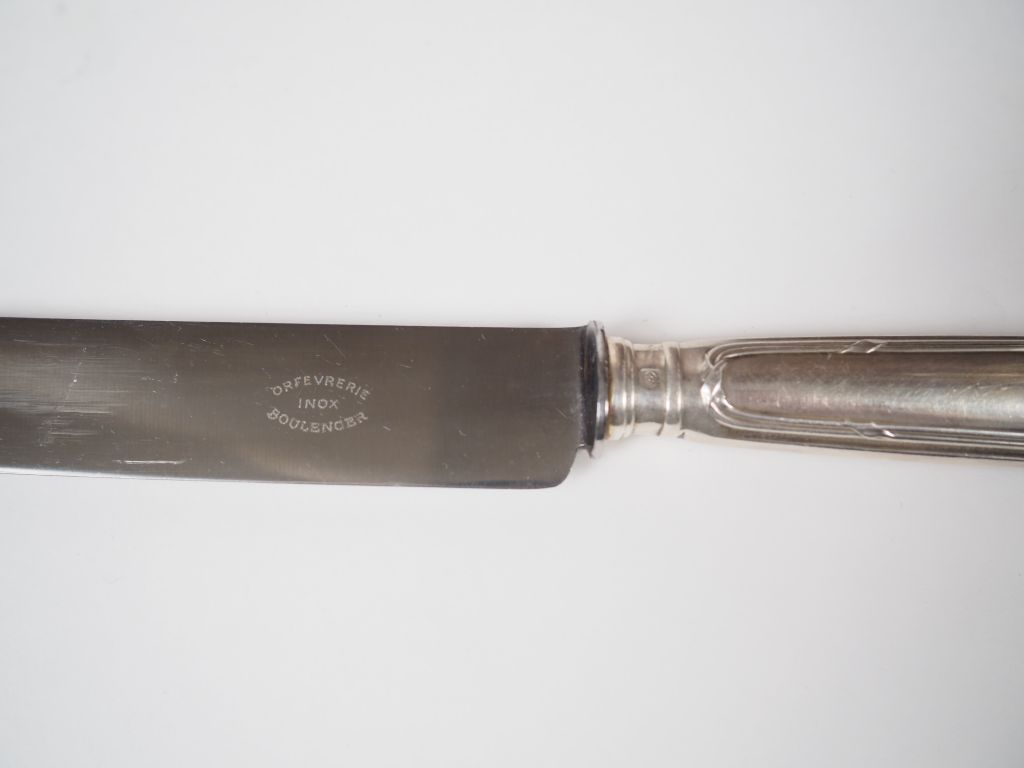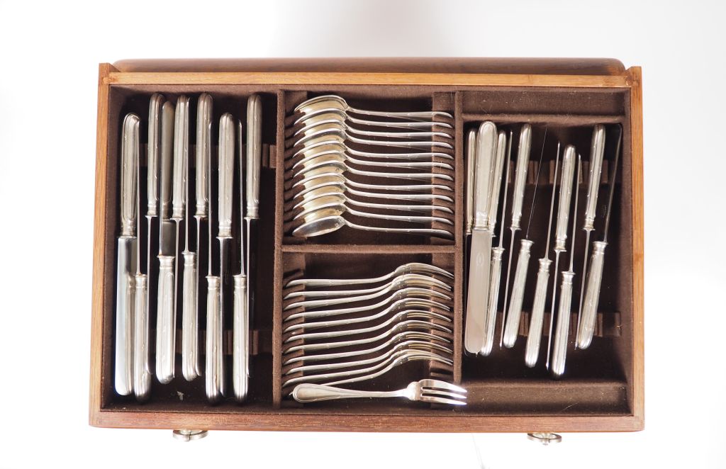 BOULENGER. Ménagère en métal argenté de style Louis XVI à décor de rubans dans son coffret d'origine à six tiroirs.