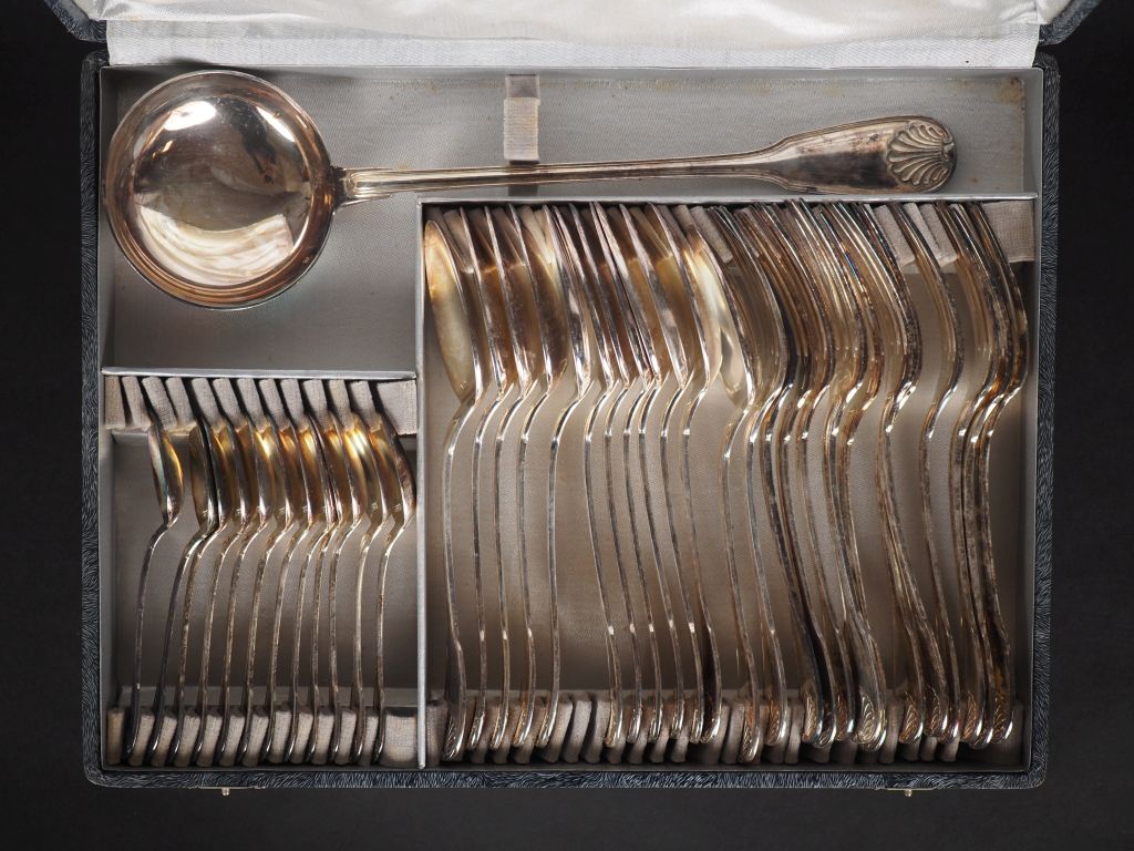 BOULENGER Partie de ménagère en métal argenté, modèle à double coquilles. Comprenant : - douze grands couverts - une louche - douze petites cuillères Dans son coffret.