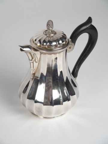 BOULENGER. Verseuse égoïste de style Louis XVI en argent, poinçon Minerve, manche en bois noirci. H. : 16 cm. Poids tel : 269 g